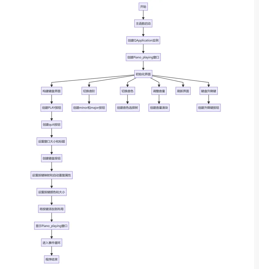 顾名思义,除了初始化ui之外,分别创建了键盘按钮,大小调切换按钮,音色切换按你牛,力度改变滑块条,更新按键,对应实现属于Qt相关技术栈,不做过多赘述。