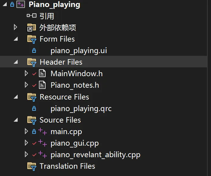 源文件:main.cpp用于存储主函数,piano_gui对ui界面的函数进行具体实现且对窗口控件进行相应创新,piano_relevant_ability项目用于存储具体发声功能以及围绕核心功能的相应实现。